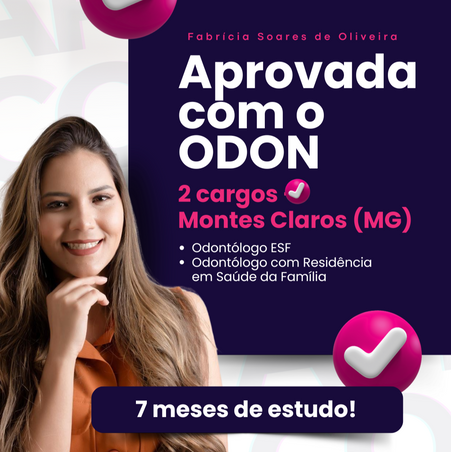 Somos a OdonConcursos, a equipe especializada que já aprovou mais de mil dentistas em concursos públicos, conquistando primeiros lugares em provas como PMMG, TRF-6, Divinópolis, Itaúna, Guaxupé e muitos outros.